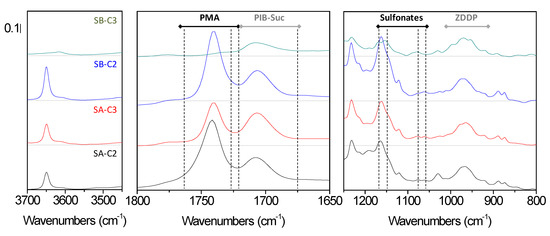 Four fully synthetic, commercial light lubricants (η = 0.103–0.116 Pa·s, Table S1) designed by two different suppliers for the use in car engines were tested. 1H NMR revealed saturated hydrocarbons constituting more than 90% of these lubricants, thus confirming their designation as fully synthetic (Figure S4). A minority of peaks was recorded in the aromatic region corresponding to alkylated phenol antioxidant in SA-C2, SA-C3, and SB-C2 in addition to an unidentified aromatic additive available in all the samples (Figure S4). The presence of phosphorous containing additives was verified by 31P NMR; basic and neutral ZDDP (zinc dialkyldithiophosphates) acting as antiwear and antioxidant were identified in all the samples [5] (Figure 2). The presence of numerous performance additives with different functional groups resulted in a complicated FTIR (Figure 3 and Figure S5). The following interesting features (bands) in the spectra were identified: at 975 cm−1 (P–O–C vibrations from ZDDP [28]), at 1705 cm−1 (C=O vibrartions from polyisobutylene succinimide “PIB-suc” dispersant [29]), at 1740 cm−1 (C=O from esters and polymethacrylates “PMA” viscosity modifiers) and at 3650 cm−1 (phenolic OH).