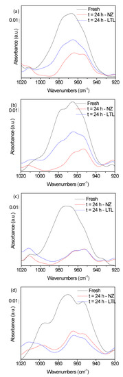 P–O–C FTIR band vibrations of (a) SA-C2, (b) SA-C3, (c) SB-C2, and (d) SB-C3 in their fresh form (black) or following 24 h of oxidation at 150 °C in absence (red) or presence (blue) of LTL nanozeolite.