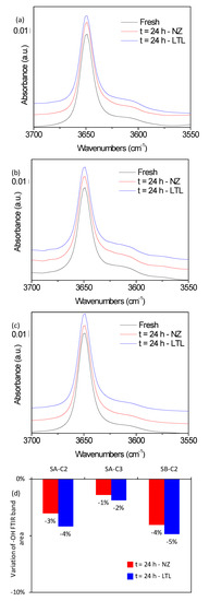 FTIR band vibrations of (a) SA-C2, (b) SA-C3, (c) SB-C2, in their fresh form (black) or following 24 h of oxidation at 150 °C in absence (red) or presence (blue) of LTL nanozeolite. (d) Evolution of –OH FTIR band area following oxidation.