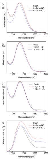 C=O FTIR band vibrations at 1705 cm−1 of (a) SA-C2, (b) SA-C3, (c) SB-C2, and (d) SB-C3 in their fresh form (black) or following 24 h of oxidation at 150 °C in absence (red) or presence (blue) of LTL nanozeolite.