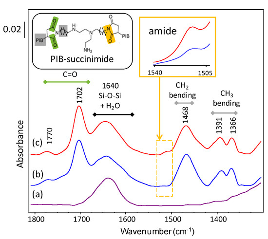 FTIR spectra of (a) fresh LTL and LTL extracted after 24 h of heating at 150 °C from (b) SA-C3, and (c) SA-C2 lubricant samples. Inset, one possible structure of PIB-succinimide.