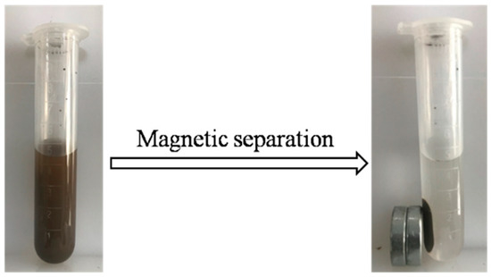 Adsorption isotherms of catechol onto g-C3N4/Fe3O4 surfaces were carried out in a capped centrifugal tube at 308 K with pH 6 by ultrasonic adsorption. A series of catechol solutions with concentrations from 6 mg/L to 300 mg/L were prepared from a stock solution of 1 g/L. The pH of the solutions was adjusted with acetic acid and ammonia solution. A total of 50 mg of the g-C3N4/Fe3O4 composites were added into 5 mL catechol standard solutions with initial concentrations as above, respectively, followed by ultrasonic adsorption for 30 min in room temperature. An external magnetic field was used to separate the g-C3N4/Fe3O4 nanocomposites from the catechol supernatant (as shown in Figure 1). The concentration of catechol solution was determined by an Ultraviolet-Visible spectrophotometer (UV-1810S, Yoke, Shanghai, China) with the maximum absorption wavelength of 275 nm.