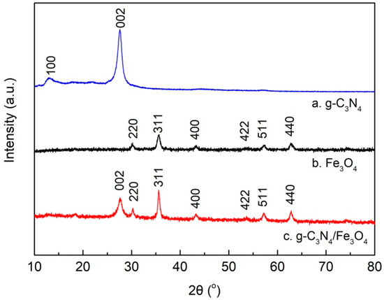 Figure 3 shows the XRD patterns of g-C3N4 (a), Fe3O4 (b), and g-C3N4/Fe3O4 (c). According to the literature [28,30], the XRD spectra of pure g-C3N4 has two characteristic peaks at 2θ = 27.4° and 2θ = 13.1°. Therefore, the strong peak at 27.4° can be attributed to the typical (002) interlayer diffraction peak, while the peak at 13.1° belongs to the (100) crystal plane diffraction peak accumulated in the interlayer structure. As shown in Figure 3a, the characteristic peaks of g-C3N4 prepared by melamine were consistent with the data stated above and the crystal database JCPDS 87-1526, with no other impurity peaks, indicating that g-C3N4 was successfully prepared. In Figure 3b, six characteristic diffraction peaks of (220), (311), (400), (440), (422), (511), and (440) could be observed at the 2θ degree of 30.2°, 35.6°, 43.3°, 53.5°, 57.1°, and 62.7°, respectively, which are in accordance with the standard Fe3O4 crystal data (JCPDS 19-0629) and literature description [28,30]. The diffraction peaks identified that the Fe3O4 had a face-centered-cubic structure [29]. In Figure 3c, both of the aforementioned characteristic diffraction peaks of g-C3N4 and Fe3O4 appeared in one XRD pattern at the same time, indicating that material c was a two-phase composite composed of g-C3N4 and Fe3O4. Furthermore, the intensity of the Fe3O4 diffraction peaks in the composite were higher than that in the pure Fe3O4 powder. Thus, the dispersion degree of Fe3O4 nanoparticles in the composite was significantly improved, which is beneficial for an increase in the adsorption sites and therefore the adsorption capacity.