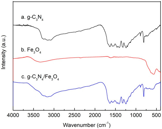 Figure 4 shows the IR spectrum of g-C3N4 (a), Fe3O4 (b), and g-C3N4/Fe3O4 (c). In Figure 4a, the broad absorption band at 3100–3300 cm−1 can be attributed to the stretching vibration of N–H in g-C3N4. Absorption peaks at 1640–1400 cm−1 can be assigned to the stretching vibration of repetitive elements in g-C3N4. Absorption peaks at 1332 cm−1 and 1244 cm−1 are due to the stretching vibration of C–N, and the absorption peaks at 808 cm−1 can be attributed to the bending vibration of triazine ring. In Figure 4b, the characteristic absorption peak around 570 cm−1 belongs to the stretching vibration of the Fe–O bond in pure Fe3O4, which is in accordance with the data in the literature [28,30]. The IR spectrum of Figure 4c shows that there are absorption peaks corresponding to Figure 4a at 3100–3300 cm−1, 1640–1400 cm−1, 1333 cm−1, 1246 cm−1, and 808 cm−1, indicating that material b is composed of g-C3N4. In addition, the peak at around 570 cm−1 was also consistent with the characteristic absorption peak of Fe–O in Fe3O4, which further proved that the g-C3N4/Fe3O4 composite was successfully prepared.
