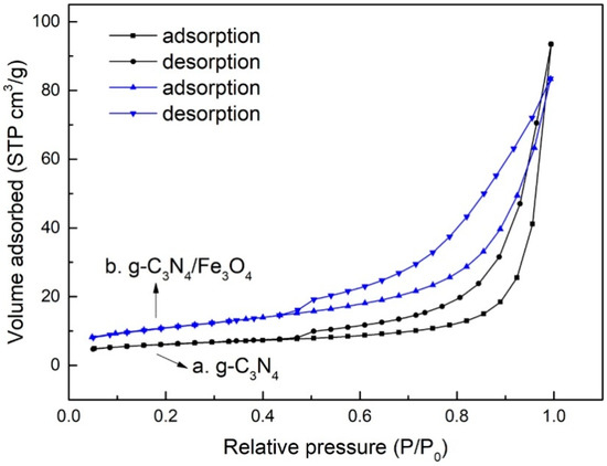 Nitrogen adsorption–desorption isotherm plots for g-C3N4 (a) and g-C3N4/Fe3O4 (b).