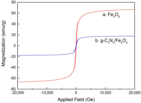 The typical magnetization curves of Fe3O4 (a) and g-C3N4/Fe3O4 (b) at 300 K are shown in Figure 6. It can be seen that the saturation magnetization (Ms) values for Fe3O4 and g-C3N4/Fe3O4 were about 66.8 and 17.7 emu/g, respectively, indicating that the g-C3N4/Fe3O4 composite presented good magnetic property. Therefore, the g-C3N4/Fe3O4 particles could be simply and quickly separated from the aqueous solutions by an external magnetic field.