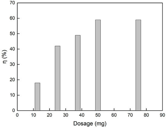 Figure 8 shows the relationship between the removal rate of catechol and g-C3N4/Fe3O4 dosage. The removal rate of catechol increased with the increase in material dosage. When the dosage was 50 mg, the removal rate reached 59%. Then, by continuing to increase the amount of g-C3N4/Fe3O4, the removal rate of catechol remained basically at the same value, which can be attributed to the adsorption equilibrium between g-C3N4/Fe3O4 and catechol.