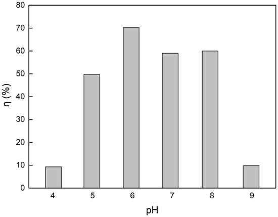The removal rates of g-C3N4/Fe3O4 for catechol under different pH were determined and presented in Figure 10, where the removal rate of catechol increased gradually with the increase in the solution pH. At a pH value of 6, the removal rate of catechol reached 70%. Then, with the increase in pH, the removal rate decreased slightly at 7 and 8, while at a pH value of 9, the removal rate decreased significantly. This suggests that the adsorption of catechol by g-C3N4/Fe3O4 materials may be the result of the interaction between charged groups (as described in Table 4 [26,35,36]). The amine groups on the surface of the g-C3N4/Fe3O4 act as proton acceptors because of the free lone pair electrons on the nitrogen atom and acquire positive surface charges [36]. At the same time, primary and secondary amine groups react with hydroxyl ions, making the g-C3N4/Fe3O4 particles negatively charged [26,35]. Under weak acid, weak base, and neutral conditions, catechol mainly presents in its molecular form, so hydrogen bonds are formed between the phenolic hydroxyl groups in catechol and the amino groups in g-C3N4/Fe3O4 materials, leading to its strong adsorption capacity. However, under strong alkaline conditions, the surfaces of the materials are negatively charged due to their deprotonation, while most of the catechol molecules are ionized, leading to the reduction in the adsorption capacity amount. This could be caused by the electrostatic repulsion between the deprotonated material and ionized catechol, thus affecting the recovery rate of the magnetic solid phase extraction. Suresh et al. [12] reported that the interaction of catechol with granular activated carbon at neutral pH occurred through hydrogen bonding. Moreno-Piraján et al. [13] and Khalfa [14] found that the best adsorption of catechol on activated carbon and dolomite both occurred at pH 7. These reported results of pH are similar to the results in this experiment. Therefore, the optimal pH value of the solution is 6.
