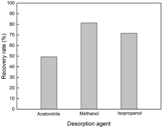 Acetonitrile, methanol, and isopropanol were added as desorption agents to investigate the desorption capacities for catechol. As can be seen from Figure 11, the desorption rates of the three desorbents were not very low, most likely due to their similar high polarity to catechol and the presence of the lone pairs of electrons, which is beneficial to the affinity of catechol. Among the three desorption agents, methanol had the highest recovery rate of 82%, followed by isopropanol with a recovery rate of 72%, and acetonitrile had the lowest recovery rate of 49%. This might be because methanol and isopropanol possess hydroxyl groups that can form hydrogen bonds with catechol, which is more easily eluted than acetonitrile. Therefore, methanol was selected as the desorption agent in this work.