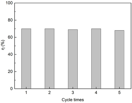 To investigate the recyclability of g-C3N4/Fe3O4, five adsorption and desorption experiments were developed under the optimum conditions obtained earlier. As shown in Figure 12, after five cycles, the removal rate of catechol by the g-C3N4/Fe3O4 composite remained at about 70%, which indicates that the material has good stability and reusability.