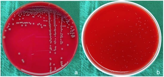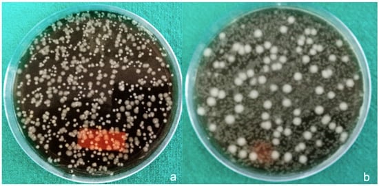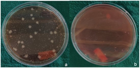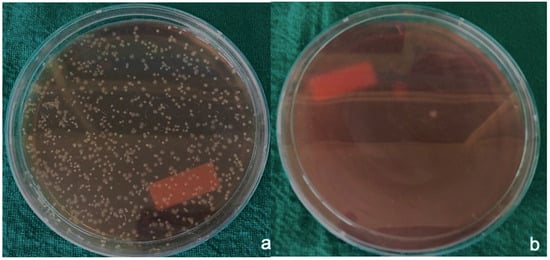 PTFE (Figure 4a) and polyamide sutures (Figure 5a) showed almost equal amounts of CFUs (≈300 × 104/suture) and vicryl sutures (Figure 6a) showed the maximum growth of aerobically cultured bacteria CFUs (≈444 × 104/suture).