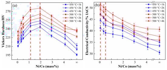 (a) Hardness and (b) electrical conductivity of alloys aged at 500 °C with different Ni/Co mass ratios.