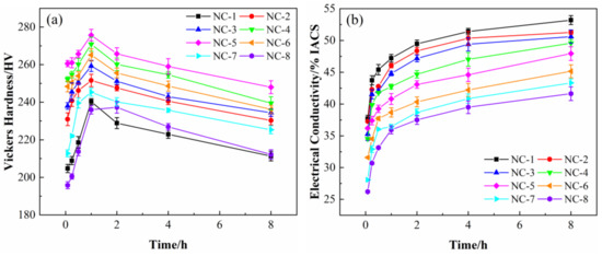 Figure 1 shows the change in conductivity and hardness of Cu-Ni-Co-Si alloys with different Ni/Co mass ratios at 450 °C and 500 °C for 1, 2, and 4 h. Under the same aging conditions, the hardness and conductivity of the alloy changes in nearly the same way. As shown in Figure 1a, the hardness of the samples first rises rapidly to the peak and then decreases sharply with an increase of the Ni/Co ratios. The hardness is higher when the Ni/Co mass ratio is 1.12–1.95 (NC-4-NC-5) and reaches its peak value when the Ni/Co ratio is 1.95 (NC-5). The trend of the conductivity with the different Ni/Co ratios is shown in Figure 1b. The conductivity of the samples is higher at low Ni/Co mass ratios and decreases gradually alongside increasing Ni/Co mass ratios. The sample exhibits good conductivity with the Ni/Co ratio of 0.05–0.5 (NC-1-NC-3), and the highest conductivity is obtained at 0.05 (NC-1). Moreover, the properties of the alloy at 500 °C are much better than those at 450 °C, both in terms of conductivity and hardness.