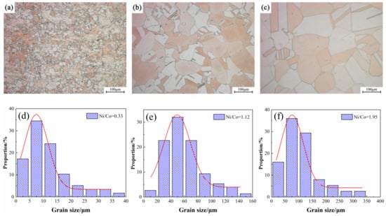 Average grain size of alloys with different Ni/Co mass ratios aged at 500 °C for 1 h; (a,d) NC-2, (b,e) NC-4, and (c,f) NC-5.