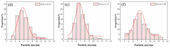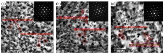 Figure 7 illustrates the bright field TEM images of the alloys with different Ni/Co mass ratios along the [001]Cu direction. A large number of precipitated particles are formed and dispersed in the matrix. In addition, the different disk- and rod-like shape characteristic are clearly visible in each bright field image. Based on the energy minimum principle, a precipitate preferentially grows along the direction of the lowest energy. The different morphologies of the precipitates are mainly due to their different growth directions, which were also reported in previous studies [3,21]. With an increase in the Ni/Co ratio, the dimension of the precipitated phase gradually increases, and the distribution becomes denser. The corresponding quantitative statistical results of the size distribution are shown in Figure 7d–f. The variation range of the average particle size remained around 6–9 nm, and the alloys are 6.98 nm, 7.96 nm, and 8.76 nm, respectively. In addition, the volume fraction and the number density of the precipitated phase also increased continuously, indicating that the precipitation process is more adequate. The main reason for this phenomenon is that many particles are not dissolved into the matrix at a low Ni/Co ratio, and the solid solution is insufficient, resulting in the lack of a precipitation driving force in the subsequent precipitation process [22].