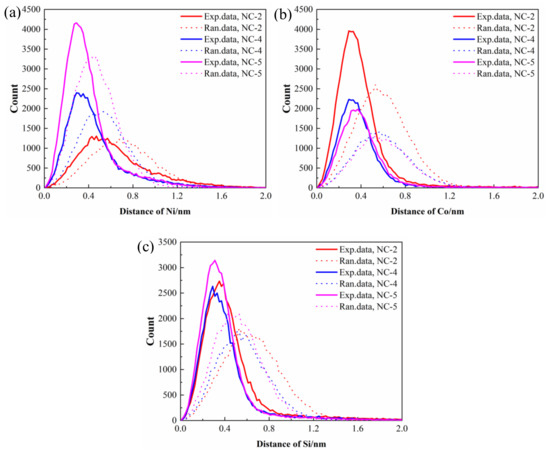 Figure 10 illustrates the corresponding first nearest neighbor (1NN) distribution analysis of solute atoms for all studied alloys. The distance between the experimental value and standard normal distribution curve represents the segregation of solute atoms in the precipitated phase [26]. Among the three alloys, Ni atoms of the NC-5 alloy and Co atoms of the NC-2 alloy show the most serious co-segregation, which corresponds well with their atomic content. For example, the amount of the Co2Si phase formed is much more than that of the Ni2Si phase in the NC-2 alloy, which leads to the larger 1NN distances of Co atoms compared to those of other solute atoms. Compared to Ni and Co atoms, the experimental 1NN distribution of Si atoms in the three alloys deviates slightly from the 1NN distributions of the corresponding random data.