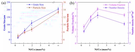 Variation curves of (a) the average grain and particle size and (b) the volume fraction and number density of alloys with different Ni/Co mass ratios.