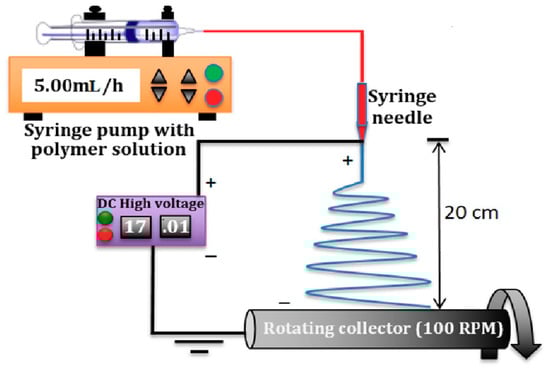 Figure 1 is the schematic of the electrospinning setup utilized in this research. A 5 mL BD plastic syringe was preheated to 70 °C, filled with polymer solution. A syringe was connected by Teflon™ tubing to a blunt stainless steel 21-gauge needle using a male and female end connector. The polymer solution was pumped using an automated syringe pump (SP220i World Precision Instruments, Sarsota, FL, USA). The syringe pump helps by delivering the polymer solution with a specific preset flowrate of 5 mL/h. Electrospinning conditions are shown in Table 2.