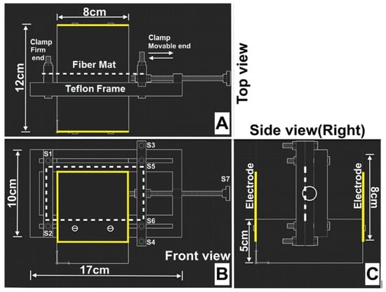 Perspective views of custom-made polarization device designed using Autodesk®-AutoCAD®-2015. Orientation of the electrospun fiber mat is indicated by the dotted white lines and aluminum electrodes are indicated by solid yellow lines. Copyright reprints from [18].