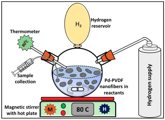 A custom-made batch reactor was utilized to study the performance of the prepared catalysts. The batch reactor was built from a 3-neck 250 mL round bottom flask. The three openings of the flask were connected to a hydrogen (H2) cylinder, a balloon, syringe for sample collection, and a thermometer as shown in Figure 3. The H2 cylinder was connected to the bottom flask via 1/8 stainless steel tubing. The balloon was used to store H2 in the reactor. The thermometer was immersed inside the reactor to measure the actual temperature of the reactants. Mixing and heating of reactants and catalyst was obtained by using a magnetic stirrer (Thermo Fisher Scientific, Waltham, MA USA).