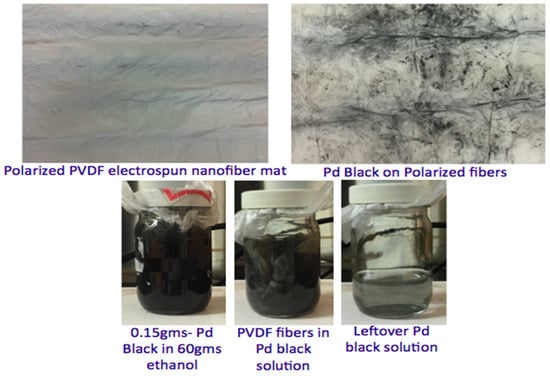 The catalytic particles were dispersed on the electrospun fibers using the traditional wet impregnation technique. A total of 0.15 g of Pd catalytic NPs was dissolved in 60 g of ethanol for one hour using a magnetic stirrer at room temperature to obtain uniform dispersion of particles. Later, PVFD fibers were immersed and stirred for five hours in the Pd–ethanol solution to impregnate Pd particles on fibers. Figure 4 shows the impregnation of Pd on PVDF NFs.