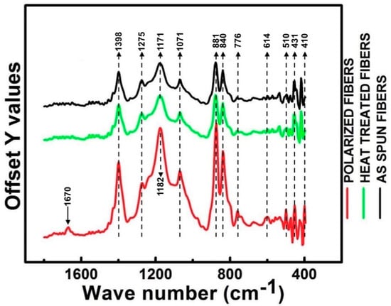 Twelve distinct absorption peaks were observed in the range of 400–1800 cm−1 wavelength as shown in Figure 6. Only α, β, and γ polymorphs were observed in all the three samples. These exclusive absorption peaks were used to characterize the crystalline structures of different PVDF samples used in this research [18]. From Figure 6, peaks at 410, 614, and 1071 belong to α-phase, 510, 840, 881, 1171–1182, 1275, and 1670 cm−1 belong to β-phase, and 431, 1398–1404 cm−1 are pertaining to γ-phase. There is a controversy among the absorption peak displayed at 776 cm−1 weather if it belongs to β or γ phase, but the majority of the researchers voted for β-phase [32].