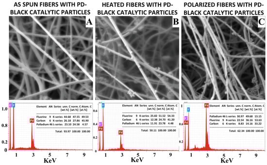 SEM micrographs of catalytic particles embedded on to (A) as-spun, (B) heat-treated, and (C) polarized PVDF fibers and corresponding EDX spectra analysis of elemental composition on the bottom.