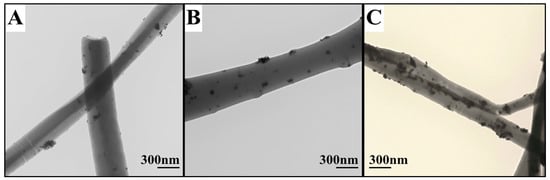 TEM micrographs of catalytic particles embedded on to (A) as-spun, (B) heat-treated, and (C) polarized PVDF fibers.