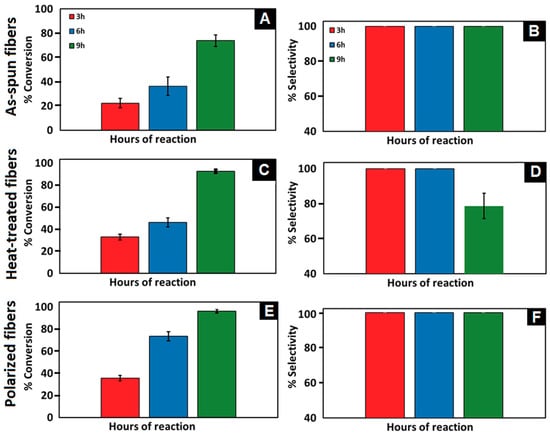 The effect of polarization on the catalytic performance was studied by testing of Pd NPs supported on PVDF NFs (5 wt.% of Pd with respect to phenol). The same amount of the polymer and the metal particles were used in as-spun, heat-treated, and polarized fiber preparation. The reaction conditions were 75 mL of 20 wt.% aqueous phenol, 1 atm pressure of H2, and 80 °C temperature. Three 5 mL samples were collected using a syringe every three hours. The results reported in Figure 10 are the summary of the conversions of phenol and selectivity of cyclohexanone using as-spun, heat-treated, and polarized Pd/PVDF catalyst from three individual experiments.