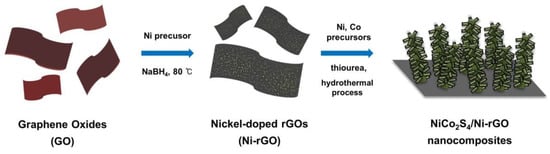 Up to now, many studies relevant to the nanocomposite of NiCo2S4 and rGO have been widely conducted [10,11]. Judging from most of the previous studies, the fabrication of hybrid nanostructures from the NiCo2S4 and conductive support materials often involves separate preparation of active and support materials and the subsequent anchoring of the both materials into hybrid nanostructures. This kind of process is found to be time-consuming and involves multi-step reactions.