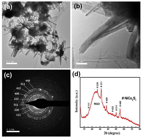 (a) Typical Transmission electron microscopic image of the NiCo2S4/Ni-rGO nanocomposites; (b) enlarged image of one branch; (c) SAED pattern of (b); (d) XRD pattern of the NiCo2S4/Ni-rGO nanocomposites.