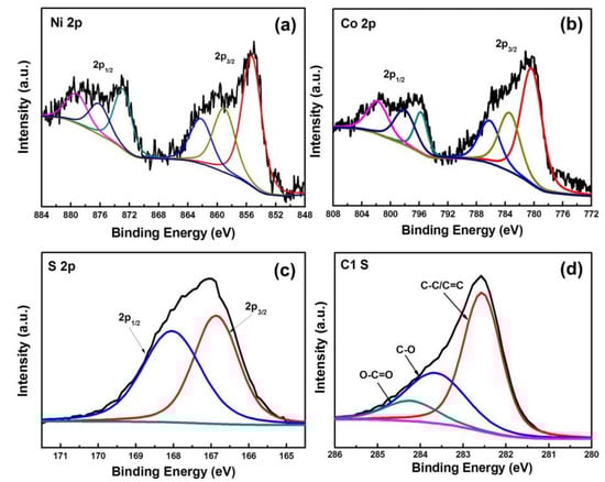 X-ray photoelectron spectroscopic spectra of the NiCo2S4/Ni-rGO nanocomposites: (a) Ni 2p; (b) Co 2p; (c) S 2p; and (d) C 1s spectra.