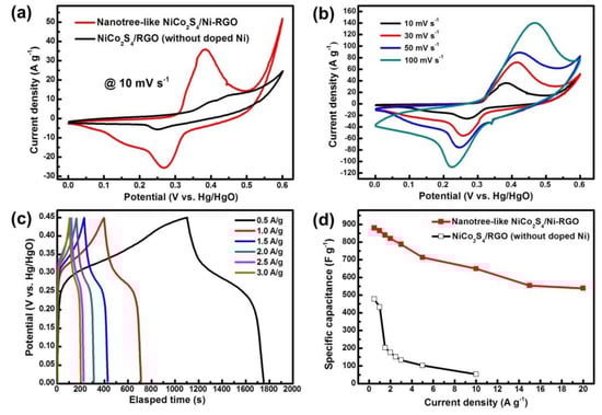 where Cs (F·g−1) is the specific capacitance, im = I/m (A g−1) is the current density, I is the current, m is the mass of active materials, is the integral current area, and V is the potential with initial and final values of Vi and Vf, respectively [22]. Figure 5d demonstrated the calculated Cs of the NiCo2S4/Ni-rGO in comparison with the NiCo2S4/rGO at various current densities. The highest and the lowest Cs values of the NiCo2S4/Ni-rGO were 879.01 F·g−1 and 538.67 F·g−1 at current densities of 0.5 A·g−1 and 20 A·g−1, respectively. Comparatively, the highest and the lowest Cs of the NiCo2S4/rGO were 477.06 F·g−1 and 52.78 F·g−1 at current densities of 0.5 A·g−1 and 10 A·g−1, respectively. In agreement with the CV results from Figure 5a, the nanotree-like NiCo2S4/Ni-rGO composites showed better capacitance than NiCo2S4/rGO.