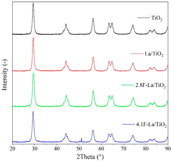 Figure 1 shows the X-ray patterns of the TiO2, La/ and F-La/TiO2 photocatalysts. Diffractograms of all photocatalysts showed diffraction lines characteristic of tetragonal modification of anatase (ICDD card no. 00-021-1272; space group I41/amd, lattice constants a = b = 0.37852 nm and c = 0.95139 nm). Coherent domain sizes were in the range of 12.9 and 14.4 nm (Table 2). Any additional diffraction lines reflecting the presence of rutile phase, brookite phase, or lanthanum related phase (pure or oxidic form) were not observed. All materials exhibited approximately the same values of lattice parameters a and c (Table 2).