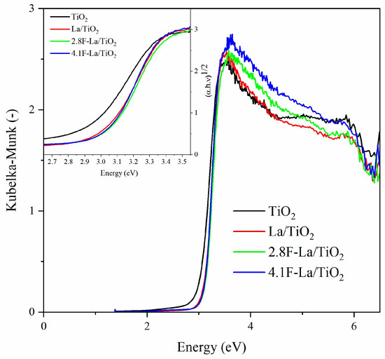 In general, the photocatalytic activity of F-La/TiO2 photocatalysts can be influenced by several factors, such as (i) band gap energy, (ii) specific surface area, (iii) rate of the recombination of electron-hole pairs, (iv) presence of oxygen vacancies, (v) amount of lattice and surface O species, and (vi) phase composition. In our case, F-La/TiO2 photocatalysts and pure TiO2 exhibited approximately the same structure, specific surface area (Table 1), and band gap energy (Table 1 and Figure 2).