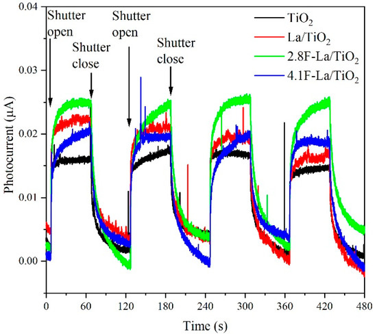 Figure 4 shows the photocurrent response for the studied photocatalysts. Photocurrent generation can predict behavior of the photocatalyst after irradiation but does not supplement its photocatalytic activity. Since the photocurrent is measured under applied external potential of 1 V, most of the generated electrons are forced to migrate to the ITO foil and measured as current. Simply said, external potential is strongly suppressing the recombination of charge carriers. Based on the results, we can claim 2.8F-La/TiO2 photocatalyst generates the highest amount of charge carriers after irradiation with 365 nm. The reason for lower photocurrent values in this study compared to that reported for La-based materials in our works [19,20] is due to the different slits setting. There are two slits, one in front of the monochromator and the second behind the monochromator, which can be set to different values. While previous measurements were done with completely opened slits, the slit behind the monochromator was currently set to 1 mm in order to have more precise wavelength steps. From that reason, the comparison is not possible.
