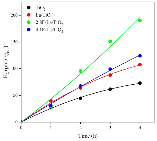 The photocatalytic generation of hydrogen from methanol-water solution during UVA illumination in the presence of investigated photocatalysts is shown in Figure 6. The formation of hydrogen is decreasing in order: 2.8F-La/TiO2 > 4.1F-La/TiO2 ≈ La/TiO2 > TiO2. The production of hydrogen in the presence of 2.8F-La/TiO2 was nearly up to 3 times higher than in the presence of pure TiO2. It also should be stressed that the hydrogen yield formed over 2.8F-La/TiO2 (Figure 6) is higher than for N-La/TiO2 [20].