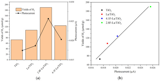 The hydrogen yield (Figure 6) clearly increased with increasing photocurrent response (Figure 4) and increasing conductivity (Figure 5). The increasing value of both photocurrent and conductivity can reflect a decrease of the recombination probability of photogenerated electron-hole pairs. Figure 7 shows the correlation between the amount of hydrogen and the photocurrent response. The trend of photocatalytic activity of F-La/TiO2 corresponds to their photocurrent responses (Figure 7b). Low photocurrent means lower amount of generated electron-hole pair after irradiation. The 2.8F-La/TiO2 photocatalyst showed both the highest photocatalytic activity and the photocurrent response as well. This is in agreement with many other authors [19,41,42,43].