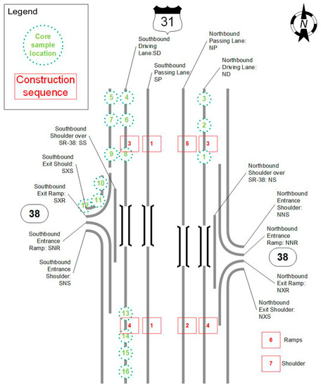 Schematic of US-31 and SR-38 with core location and construction sequence.
