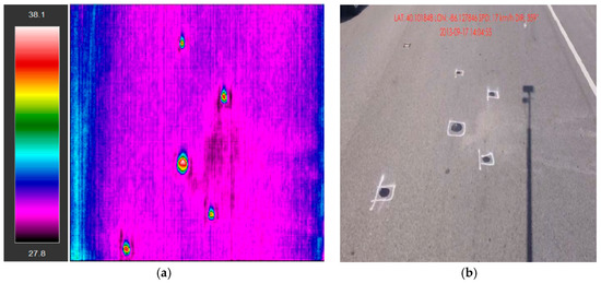 Figure 4a,b shows the images taken from the IR camera and the right of way camera, respectively. Note that the two cameras were taking photos simultaneously. As shown, all the five popout locations in Figure 4b were successfully captured by the IR camera in Figure 4a. The different colors in the IR image indicate temperature differentiation. The clay balls were identified in these areas with high temperature differentiate (i.e., higher temperature in the middle with lower temperature around). In general, a total of 633 holes (346 holes on the mainline and shoulders and 287 holes from ramps) were cleaned and filled with asphalt sealant, among which 564 cores were successfully captured by the IR camera. Among all the clay balls (69 in total) that were not successfully captured by the IR, the majority (50 in total) were missed due to the very small size of clay balls (i.e., with diameter less than 1 cm). It is noted that the angle of the two photos are not exactly the same: The IR camera took photos vertically perpendicular to pavement surface, whereas the right of way camera took photos with an angle to pavement surface.