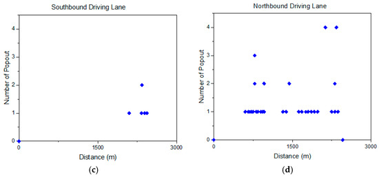 Clay ball distribution within (a) southbound exit ramp, (b) northbound exit ramp, (c) southbound driving lane, and (d) northbound driving lane.