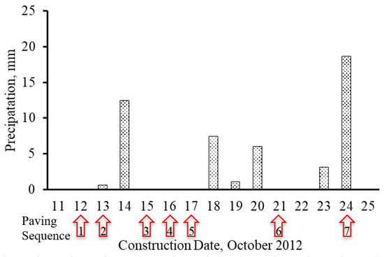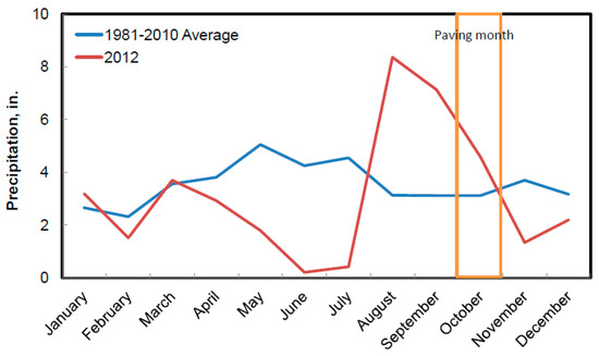During paving, there were seven raining days, and no construction was conducted on those days. Figure 8 shows precipitation distribution within each month in 2012, as well as the average monthly precipitation based on years from 1981 to 2010. It is shown in the figure that precipitations in October 2012 were much high compared to its companion averaged from 1981 to 2010.