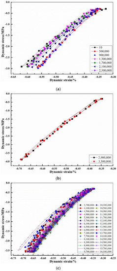 Owing to a large amount of data, 10 groups of hysteresis curve data were selected and averaged every 400,000 vibrations before further processing. In the course of 22,000,000 times of cyclic loading, the corresponding stress levels and frequencies were not the same. Therefore, the dynamic stress–strain hysteresis curves were drawn by stages for analysis. The dynamic stress–strain hysteretic curves of 0–2,500,000, 2,500,000–3,500,000, 3,500,000–16,350,000, and 16,350,000–22,000,000 times are respectively shown in Figure 4a–d.