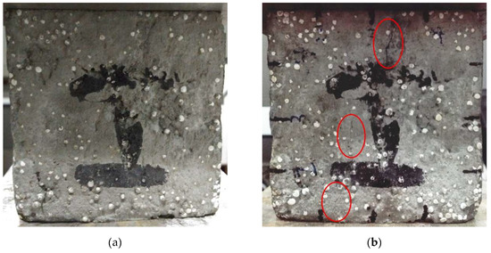 It can be seen from Figure 4c that in the dynamic stress–strain hysteresis curves corresponding to 15.7 million times, the strain with the same stress level was obviously larger. Referring to the test records, the specimens had fine cracks at about 15.7 million vibrations as shown in Figure 5. Figure 5a is the face of the specimen for 15.50 million vibrations before micro-cracks appeared, and Figure 5b is the specimen at 16.35 million vibrations after micro-cracks were observed. It could be observed from Figure 5 that some micro-cracks appeared on the face of the structural EPS concrete. The existence of fine cracks made the curve appear unstable for a while, but the specimens were stabilized again when the vibrations continued, and the dynamic stress–strain curve also tended to be consistent.
