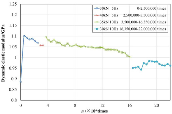 From 3.5 million cycles to 16.35 million cycles, it was found that even with the same load and frequency, the dynamic elastic modulus of structural EPS concrete had an explicit tendency of gradually decreasing with the accumulated cycles. Accompanied by the propagation of micro-cracks and the generation or pooling of new cracks, an increase in deformation and a decrease in the dynamic elastic modulus were thus monitored. In particular, micro-cracks appeared on the face of the specimen near the 15.7 million cycles, and the value of the dynamic elastic modulus oscillated, but then gradually stabilized. After 15.7 million cycles, the dynamic elastic modulus only slightly decreased to a value between 0.944 and 0.992 GPa.