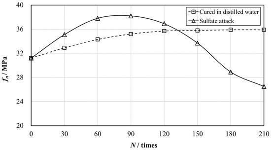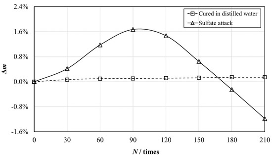 It was found that Kf was 94.1% when the cyclic number reached 150, which meant that the sulfate resistance level of structural EPS concrete was over KS150, the maximum sulfate resistance level regulated by the specification [30]. Kf was not below 75% until the 210th W-D cycle came, so the sulfate attack experiment was carried out to the cyclic number of 210.