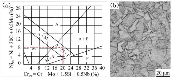 (a) Schaeffler diagram, and (b) microstructure of the 304 stainless steel.