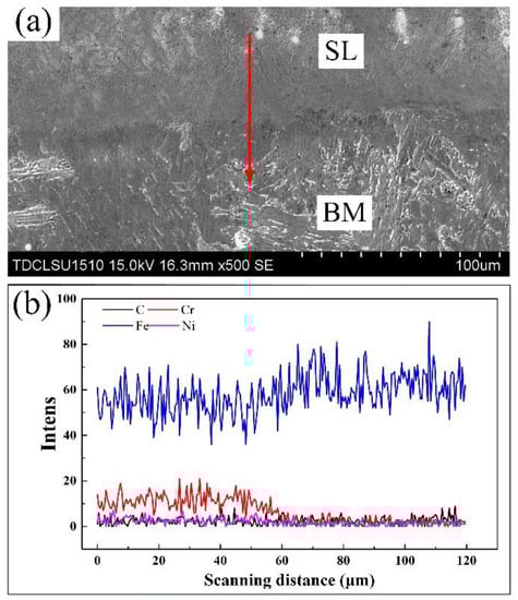 The EDS line scan of Fe, Cr, C, and Ni was carried out from the surfacing layer (SL) to base material (BM), as shown in Figure 6. These main elements in the surfacing layer are quite different in content from the base material. Cr and Ni content was found to be high in the surfacing layer and then drops sharply at the interface. Before the surfacing process, the content of Cr and Ni in the base material was zero. Fe is the main element in Q235 low carbon steel, which increases significantly at the interface between the surfacing layer and the base material. The occurrence of Cr and Ni in the base material indicates the diffusion of alloying elements in the fusion zone and a good combination between the base material and the surfacing layer.