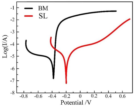 Based on previous research [,,], 3.5% NaCl solution was used as the electrolyte (pH = 7) in the electrochemical corrosion test. The NaCl solution was prepared using analytical grade NaCl and deionized water. The test was conducted in an electrochemical workstation (LK3200A, Lanlike Chemical Electronic, Tianjin, China) with a modified three-electrode system. A platinum sheet (10 × 10 × 1 mm3) and a saturated calomel electrode (SCE) acted as counter electrode (CE) and reference electrode (RE), respectively. The sample was used as the working electrode (WE). Only the surface area of the samples was exposed to the electrolyte solution during the test. The test parameters included open circuit potential, and potentiodynamic and potentiostatic polarization. Before the polarization test, the open circuit potential was executed to determine the stability of the corrosion potential. The potentiodynamic polarization test was carried out to measure the corrosion potential (Ecorr) and corrosion current density (icorr) of the as-received, surface modified, and welded samples. Scan rate was 0.5 mV/s, and the potential ranged from −800 mV to +500 mV.