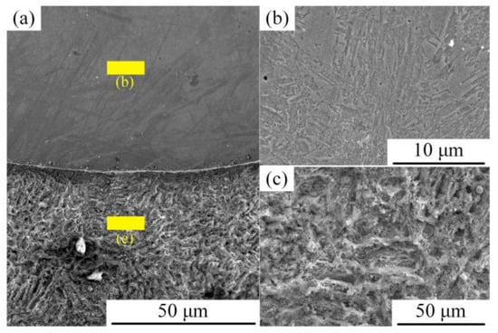 To observe the microstructures of the surface-modified plate and its welded joint, metallographic samples were cut along the cross section of the plate and the weld seam. The samples were then polished and etched according to standard procedure []. The base material was etched by 4% nital alcohol solution for 8 s to reveal the interfacial microstructure. Due to high corrosion resistance of the stainless steel, the etchant used was aqua regia (the volume ratio of hydrochloric acid to nitric acid was 3:1) for 5 s. Following preliminary investigations, the welded joints were also etched using aqua regia for 5 s. All the samples were etched at room temperature. The microstructures of the cladding layers were characterized using XJP300 optical microscope and S4800 scanning electron microscope (Hitachi, Tokyo, Japan)(Manufacture, City, State abbreviation, Country).
